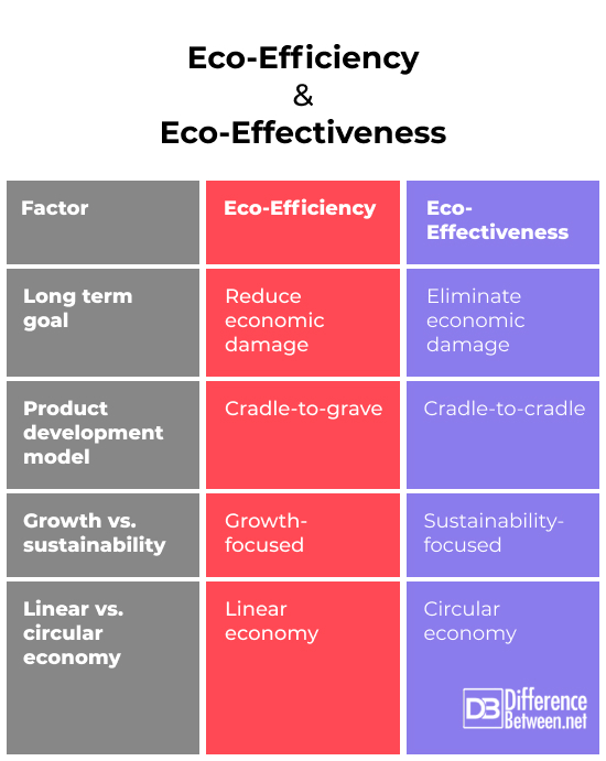 - Eco-efficiency generally remains focused on economic growth while minimizing environmental damage, whereas eco-effectiveness is a shift away from a focus on economic growth and towards a focus on sustainability.