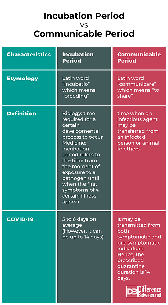 “Incubation” came from the Latin word “incubatio” which means “brooding”. In comparison, “communicable” came from the Latin word “communicare” which means “to share”.