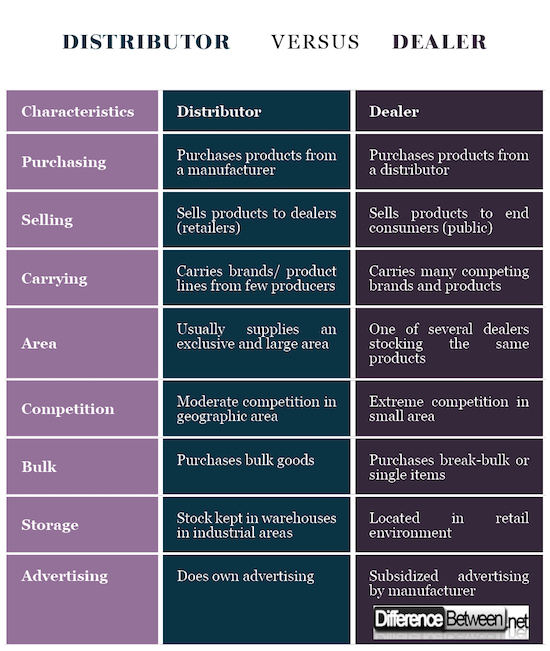 Although both distributors and dealers are required to purchase the goods that they sell, there are several differences between the two: