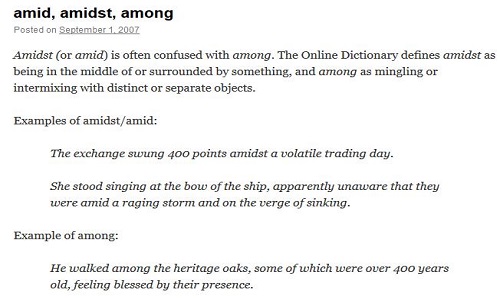 Often “amid” and “amidst” are confused with “among” or “amongst.” While these words are very similar in meaning and both have the same ending, there is a subtle difference to be noted. The difference is that “among” or “amongst” has the meaning of being intermixed with distinct or separate objects. Both words are also used for plurals of countable nouns. For example: Summer vacation brings delight among schoolchildren.