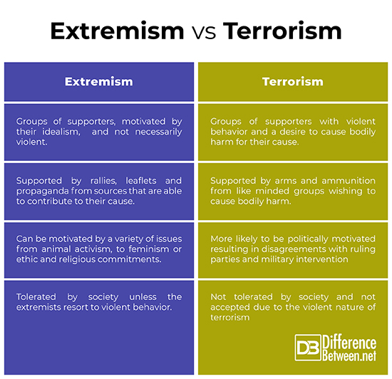 - Their differences appear through the amount of violence attributed to terrorism while an extremist may not necessarily be violent. A terrorist by definition is violent.