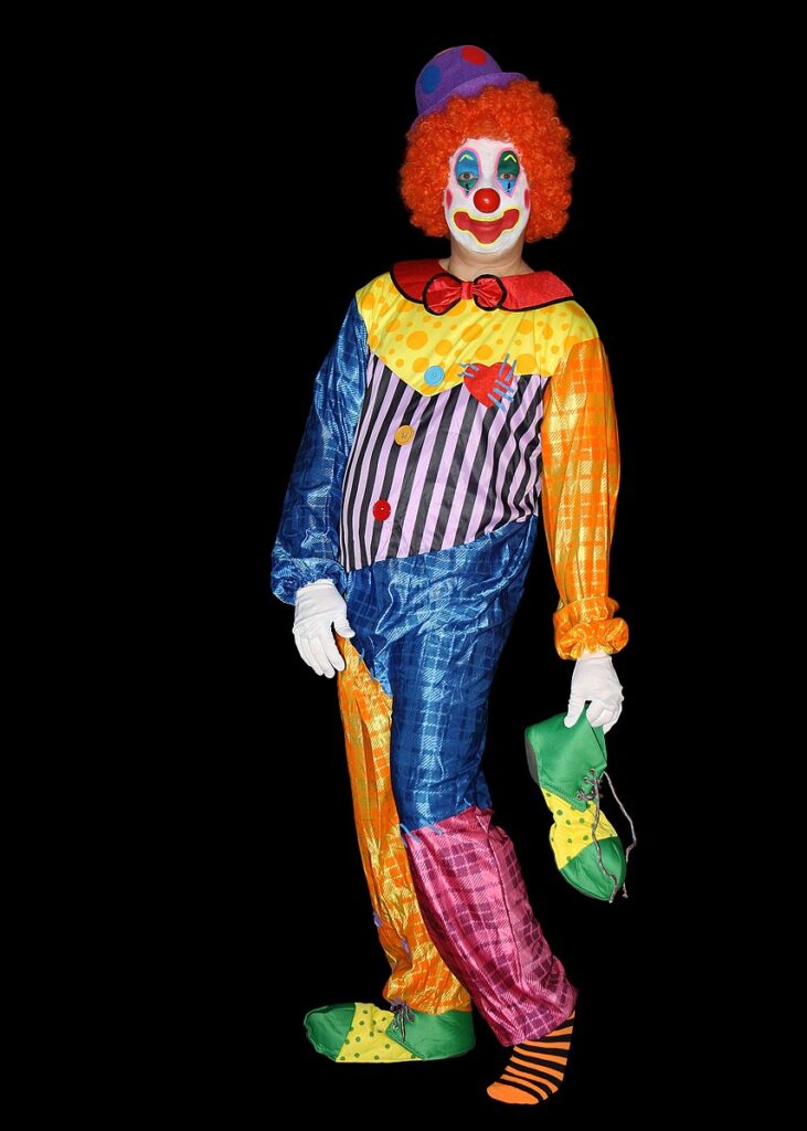 While mimes employ precise choreography to invoke an idea, clown characters use flamboyant and eccentric elements to invoke a reaction hence the use right colors.
