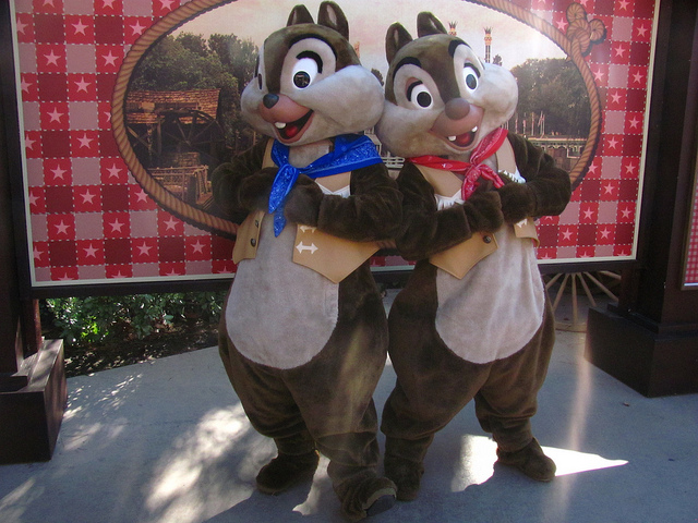 In a Disney’s theme park, Chip appears with a black nose, one tooth, and wide eyes while Dale appears with a red nose, two teeth, and droopy eyelids.