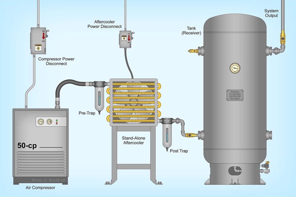 An aftercooler is a mechanical heat exchanger that cools air to within 5-20 degrees Fahrenheit of ambient temperature as soon as it is discharged from the compressor. It is a mechanical device comprises of a series of tubes and fins, which uses ambient air to condense out moisture in the compressed air. It is a sophisticated air cooler installed at a point after air has been compressed. They are cooled by either air or water. Air-cooled aftercoolers are known as air-to-air and use ambient air to cool the hot compressed air. Water-cooled aftercoolers are known as air-to-water and use water to cool the air. Heat from the compressed air is transferred to the water and water vapor forms as the compressed air starts cooling. This results in better heat transfer with no electricity required.