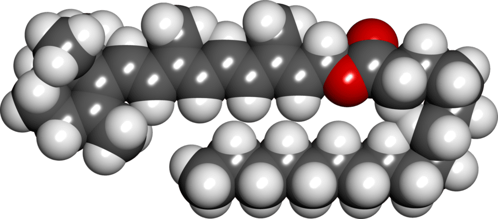 The molecular formula for retinyl palmitate is C36H602 and the molecular mass of the chemical is 524,86 g/mol, and the melting point is about 28.5 degrees Celsius. The ester of retinol has better stability than retinol and is why this is often the form that vitamin A occurs in when present in supplements or cosmetic products. Even though the retinyl palmitate is a different molecular form than retinol it is also taken up through the intestine in the same manner and can be stored in the liver of the body.