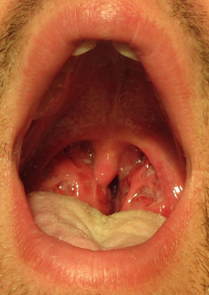The symptoms of strep throat include having a painful throat and finding swallowing to be painful. The tonsils are often red and swollen and covered in white areas of pus. There may be red spots present at the back of the mouth as well. The lymph nodes in the neck and jaw also often enlarge when a person has strep pharyngitis. Strep can lead to complications such as kidney disease and rheumatic fever.