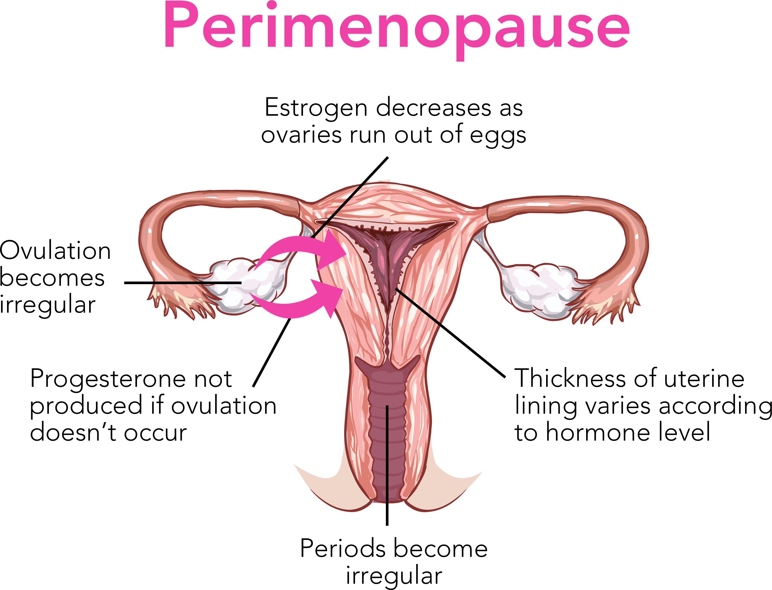 Perimenopause: The symptoms of perimenopause include irregular period, fertility issues, worse PMS, heavier or lighter period than normal, weight gain, breast tenderness, increased heartbeat, headache, loss of sex drive, concentration difficulties, forgetfulness, urinary tract infections, muscle pain, hair changes.